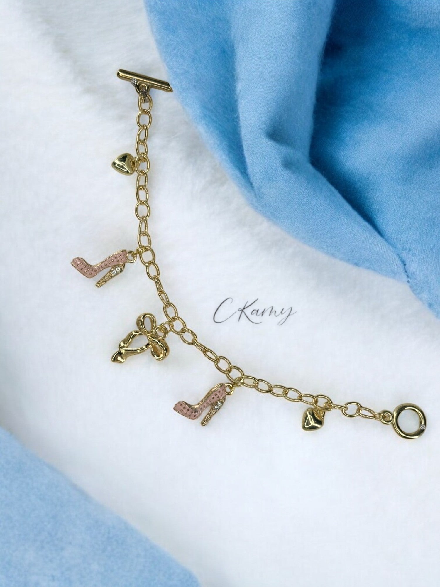 Bracelet femme, Chaine en acier inoxydable dorée. Modèle : Talon Strassé Rose.