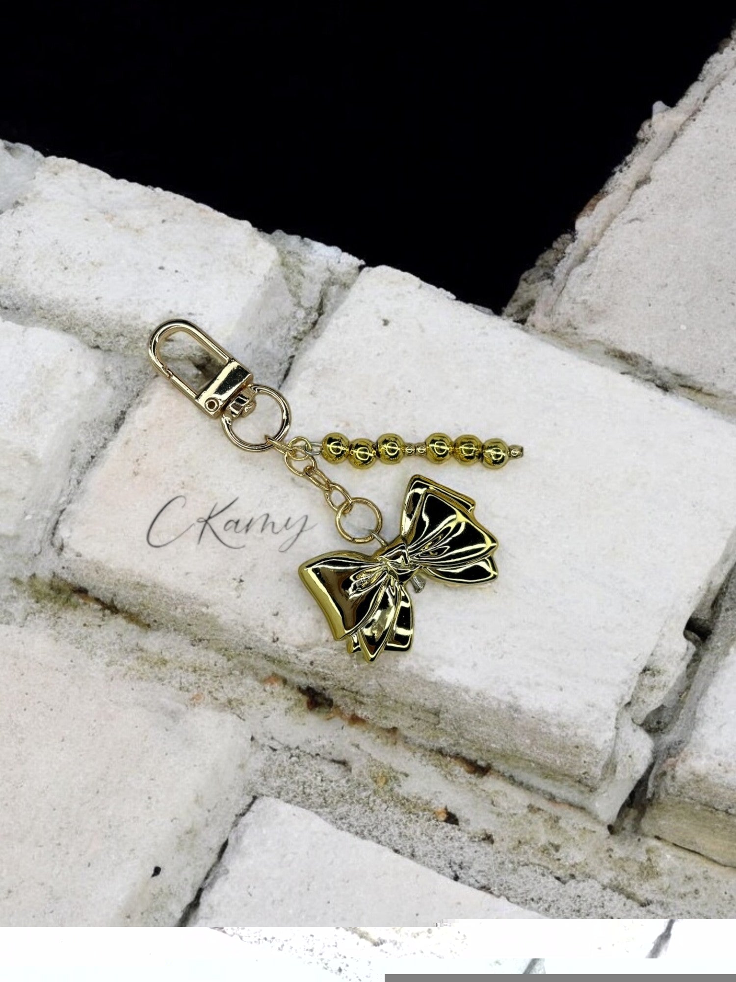 Ce porte clé personnalisé est fait d'un fermoir et d'une chainette dorée, avec un nœud doré à l'extrémité.
